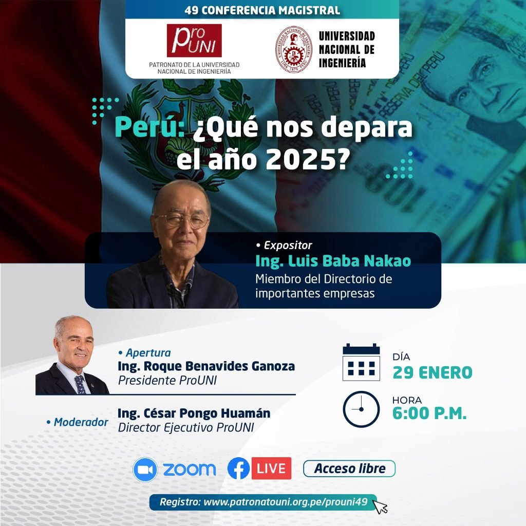PROUNI invita a la Conferencia Magistral “Perú: ¿Qué nos depara el año 2025?” a cargo del Ing. Luis Baba Nakao, Miembro del Directorio de importantes empresas